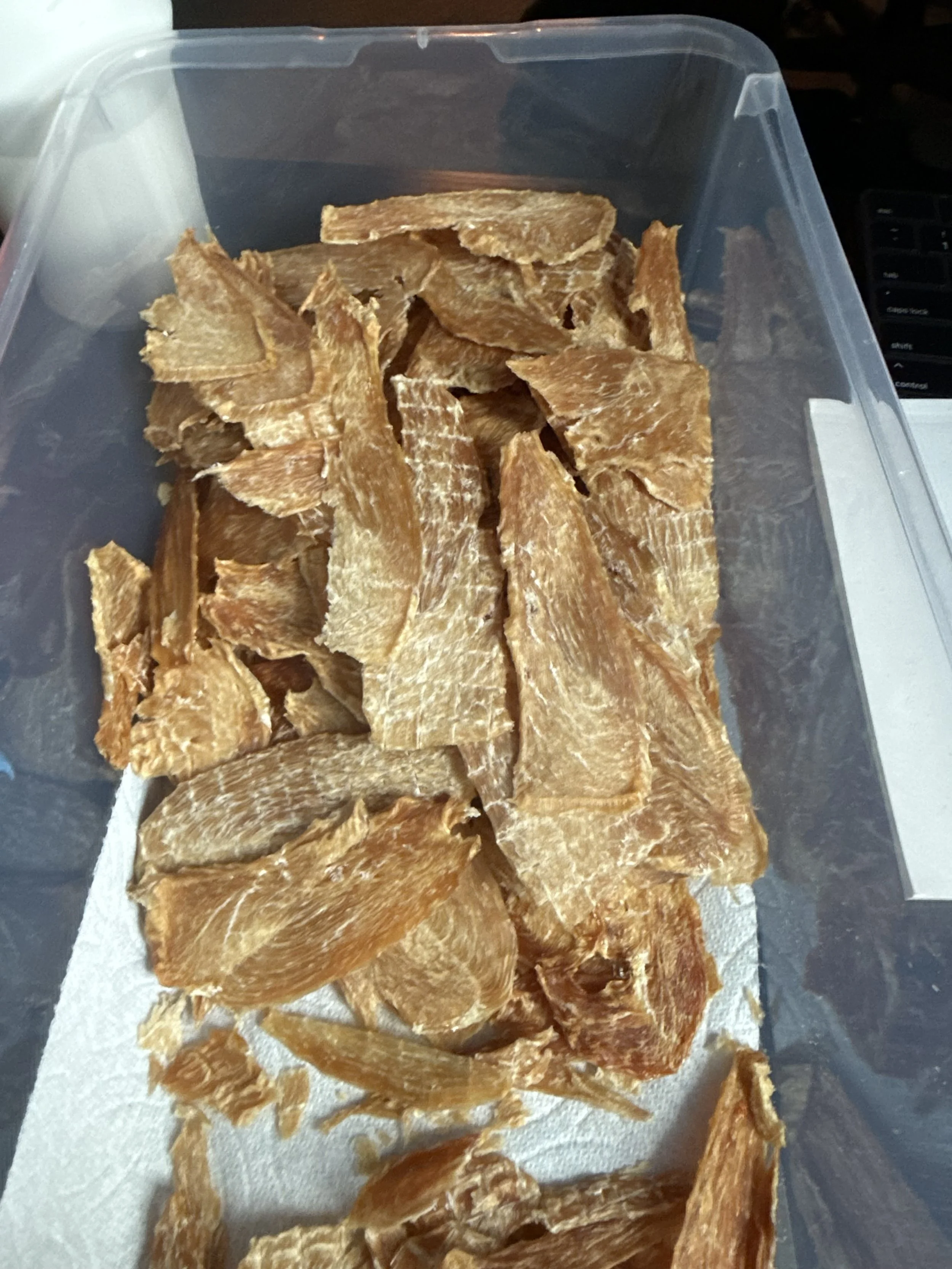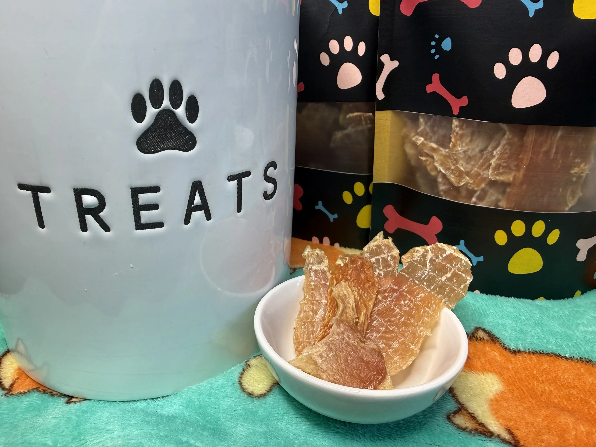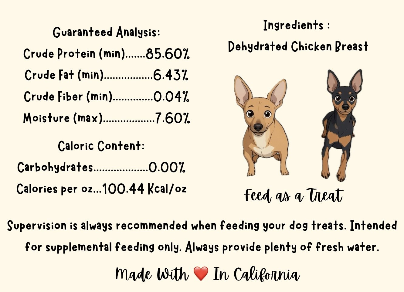 Jada and Hectors Chicken Chip Dog Treats are made with 100% Dehydrated Chicken Breast dehydrated to give it a nice crispy crunch that melts in your mouth after! We make these treats with no additives or preservatives just dehydrated chicken to keep my dogs healthy, full of energy! Jada and Hector love these treats so much and it is hard to find good, healthy, fresh made treats so we wanted to share them with all of you and your pups! They are a great source of protein, with nothing bad added. Try Some Today!